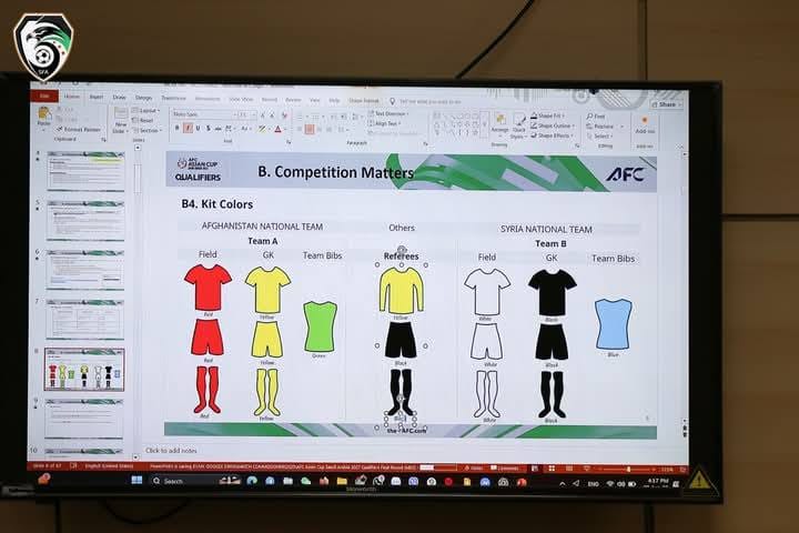 وسيرتدي منتخب سوريا الزي الأبيض، فيما سيظهر الحارس بالزي الأسود، بينما يلعب منتخب أفغانستان باللون الأحمر، وحارس مرماه باللون الأصفر.