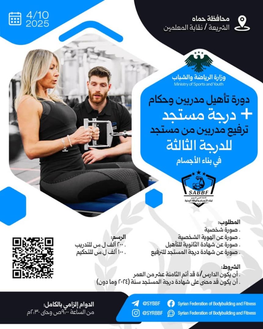يقيم اتحاد بناء الأجسام واللياقة البدنية دورة تأهيل مدربين وحكام جدد (درجة مستجد) وترفيع مدربين من درجة مستجد إلى الدرجة الثالثة برياضة بناء الأجسام خلال الفترة من ٤-٩ الشهر الجاري في قاعة نقابة المعلمين بحي الشريعة في محافظة حماة.