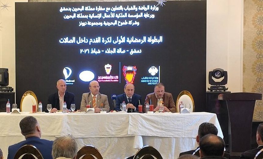 عقد اليوم في صالة ديونز بدمشق المؤتمر الصحفي للإعلان عن إطلاق البطولة الرمضانية الاولى لكرة القدم داخل الصالات التي تقام بالتعاون بين وزارة الرياضة والشباب في سورية والسفارة البحرينية بدمشق وبتنظيم من الاتحاد السوري لكرة القدم، والمقرر انطلاقها في 12 من الشهر الجاري بالتزامن مع يوم الرياضة في البحرين، بمشاركة 16 فريقاً وذلك في صالة الجلاء الرياضية بدمشق.